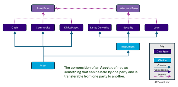 • Instrument: An asset that is issued by one party to one or more others; Instrument is also a choice data type.