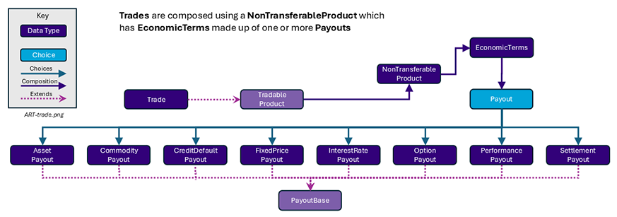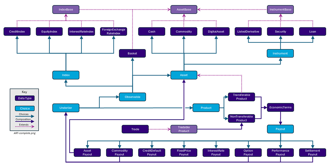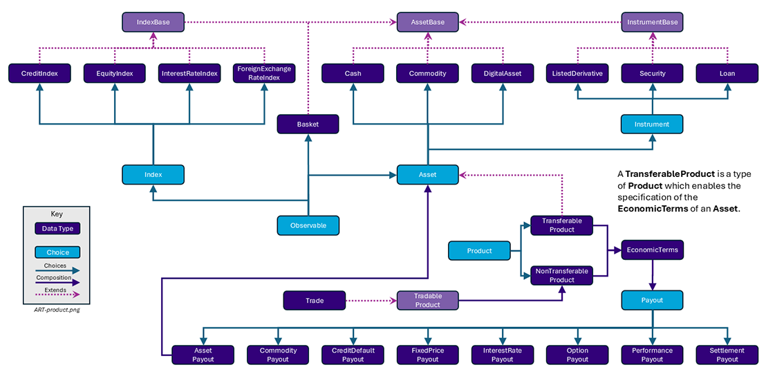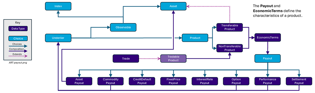 The model is based on several building blocks to define the characteristics of that risk transfer. The most fundamental of these building blocks is an Asset, which represents a basic, transferable financial product such as cash, a commodity or security. From those basic transferable assets, any other financial product can be built using other composable building blocks called Payout that are assembled to represent the complete EconomicTerms of that product. A Payout is a parametric description of the commitment between two parties to the transfer of one or more assets in the future - for instance, but not exclusively, future cashflows when that asset is cash. These future transfers may be contingent on the future value or performance of that asset or other, as in the case of options.