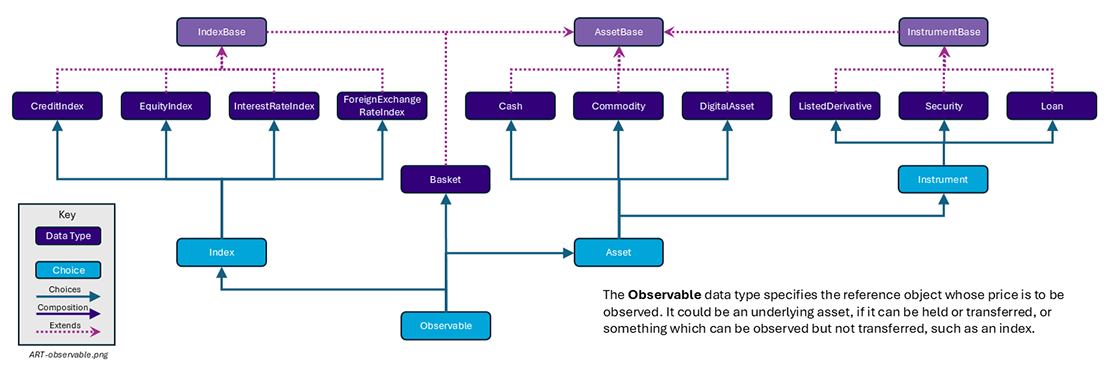 The Observable data type specifies the reference object whose price is to be observed. It could be an underlying asset, if it can be held or transferred, or something which can be observed but not transferred, such as an index.
