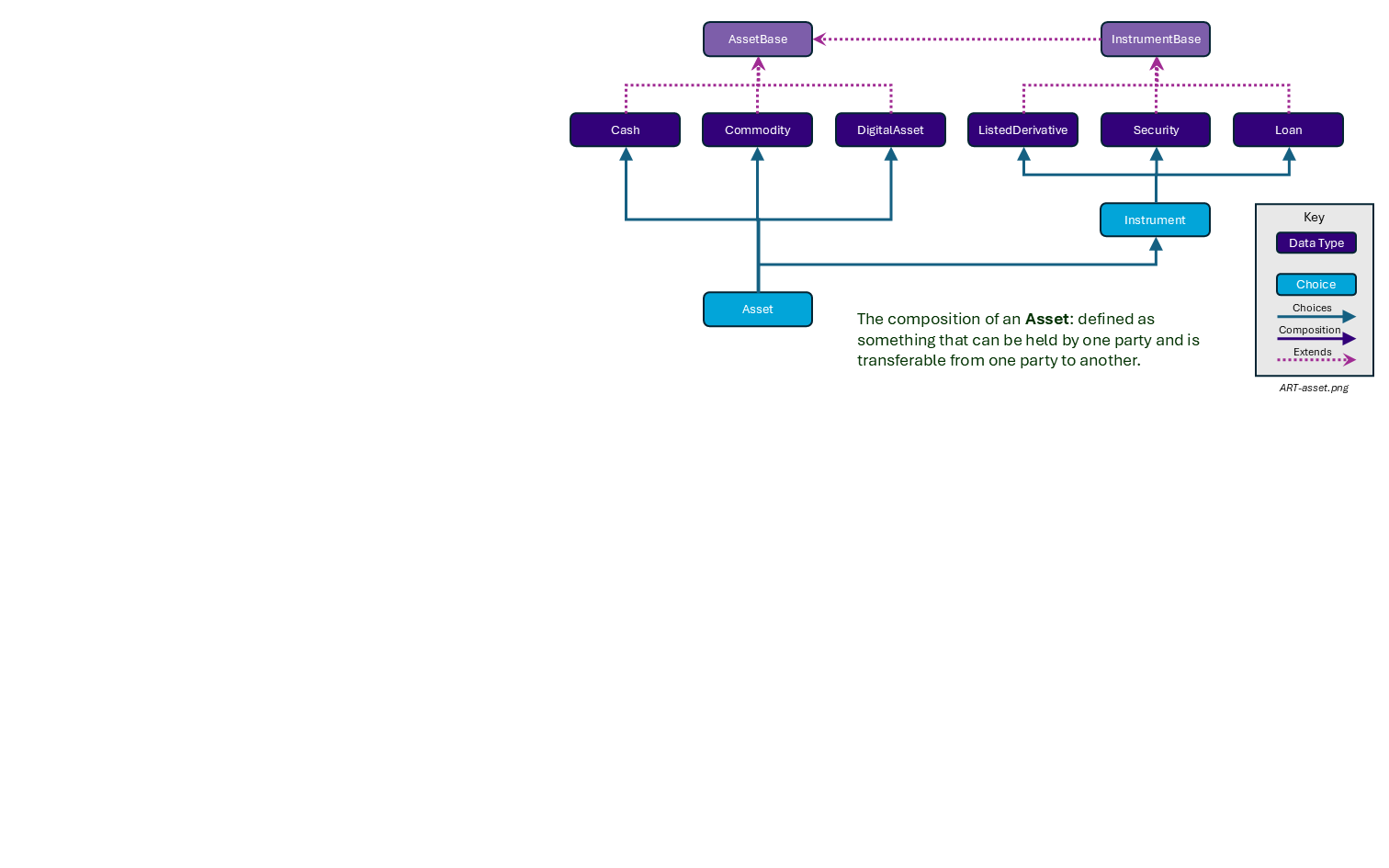 • Instrument: An asset that is issued by one party to one or more others; Instrument is also a choice data type.
