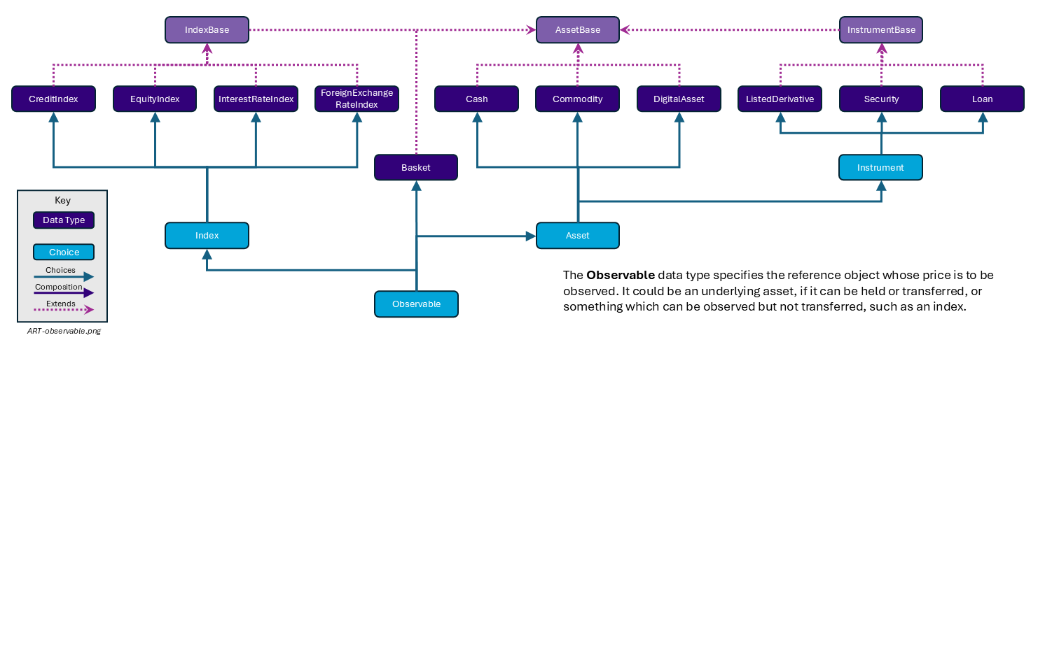 The Observable data type specifies the reference object whose price is to be observed. It could be an underlying asset, if it can be held or transferred, or something which can be observed but not transferred, such as an index.