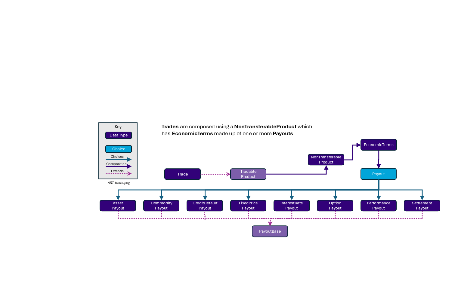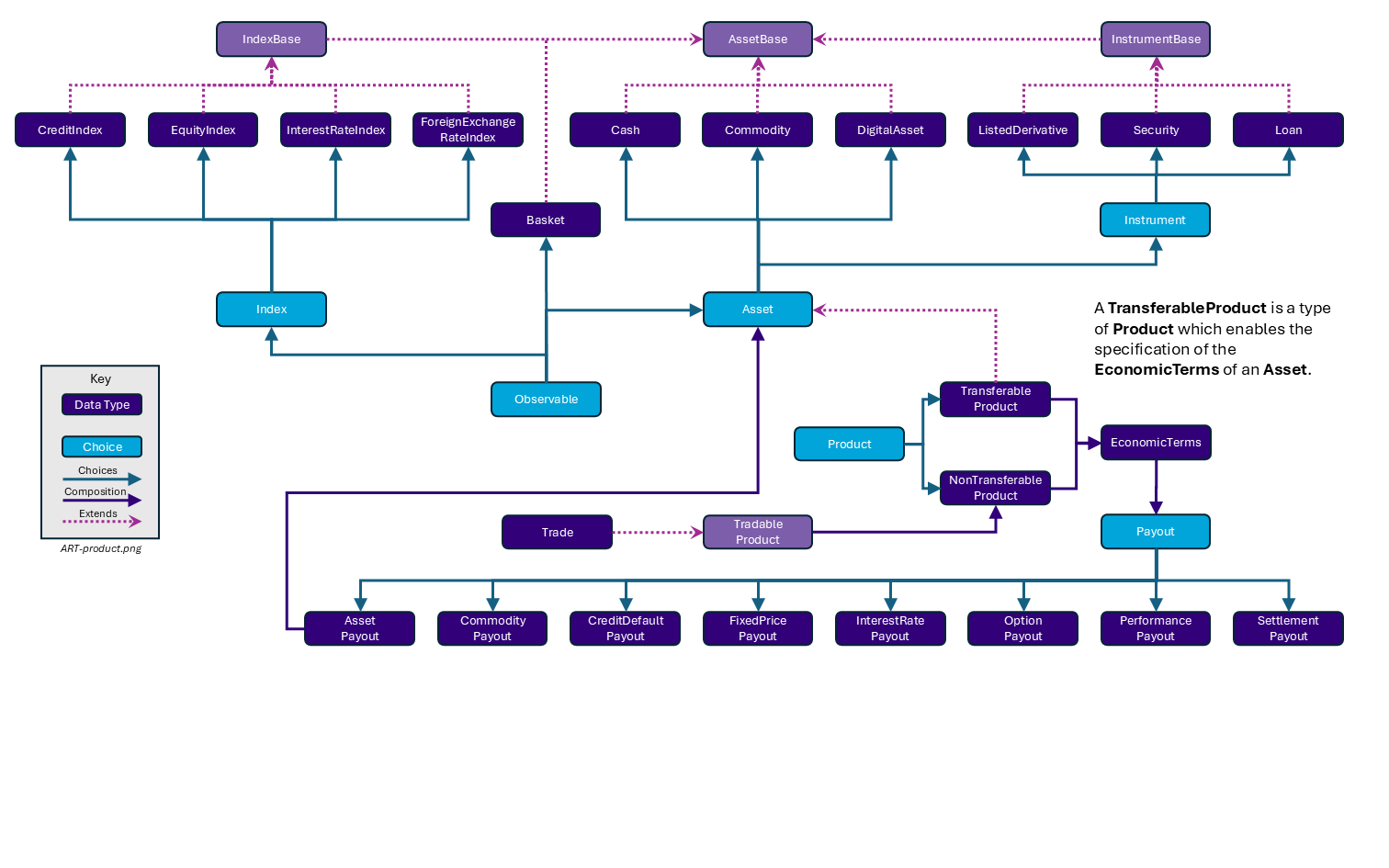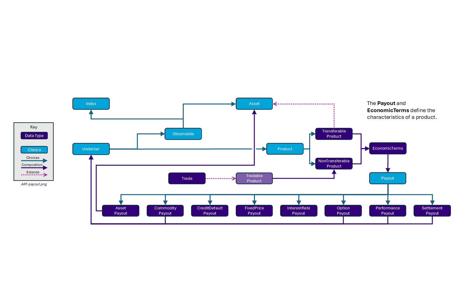 The model is based on several building blocks to define the characteristics of that risk transfer. The most fundamental of these building blocks is an Asset, which represents a basic, transferable financial product such as cash, a commodity or security. From those basic transferable assets, any other financial product can be built using other composable building blocks called Payout that are assembled to represent the complete EconomicTerms of that product. A Payout is a parametric description of the commitment between two parties to the transfer of one or more assets in the future - for instance, but not exclusively, future cashflows when that asset is cash. These future transfers may be contingent on the future value or performance of that asset or other, as in the case of options.